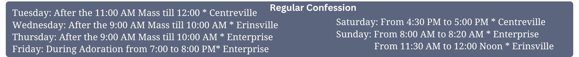 Wednesday December 24 4:30pmin Assumption Church, Erinsville for the repose of the souls of Joe & Barb O’Neill 5:30pm in St. Anthony Church, Centreville for the repose of the soul of Laura Craigen Medeiros 6:30pm in Annunciation Church, Enterprise for the repose of the souls of Gerard Clair and the deceased members of the Clair family